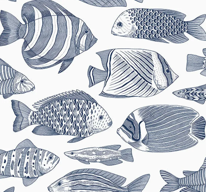 Admire the gentle rhythms of underwater life with this whimsical animal wallpaper. A school of tropical fish are inked in an array of intricate blue patterns against a white backdrop. Wailea is an unpasted, gravure acrylic coated wallpaper.