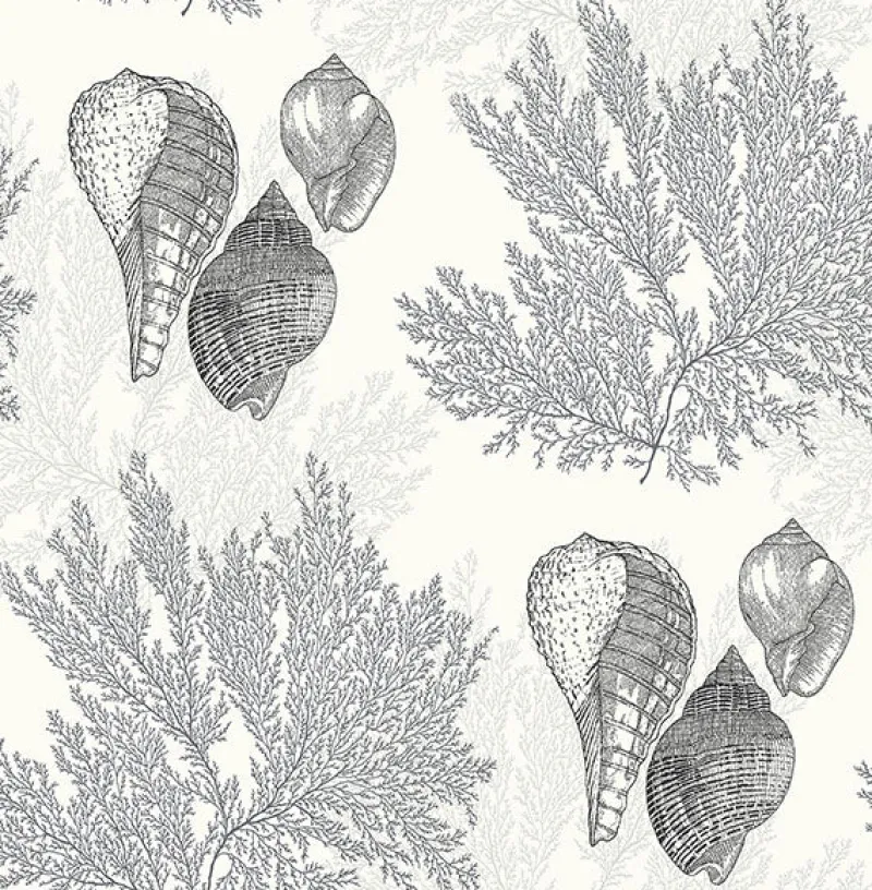 This modern take on traditional coastal design brings a sophisticated beach vibe to your space. The off-white background is layered with lacy coral and spiraled seashells inked in shades of grey and black. Nauset is an unpasted, gravure acrylic coated wallpaper.