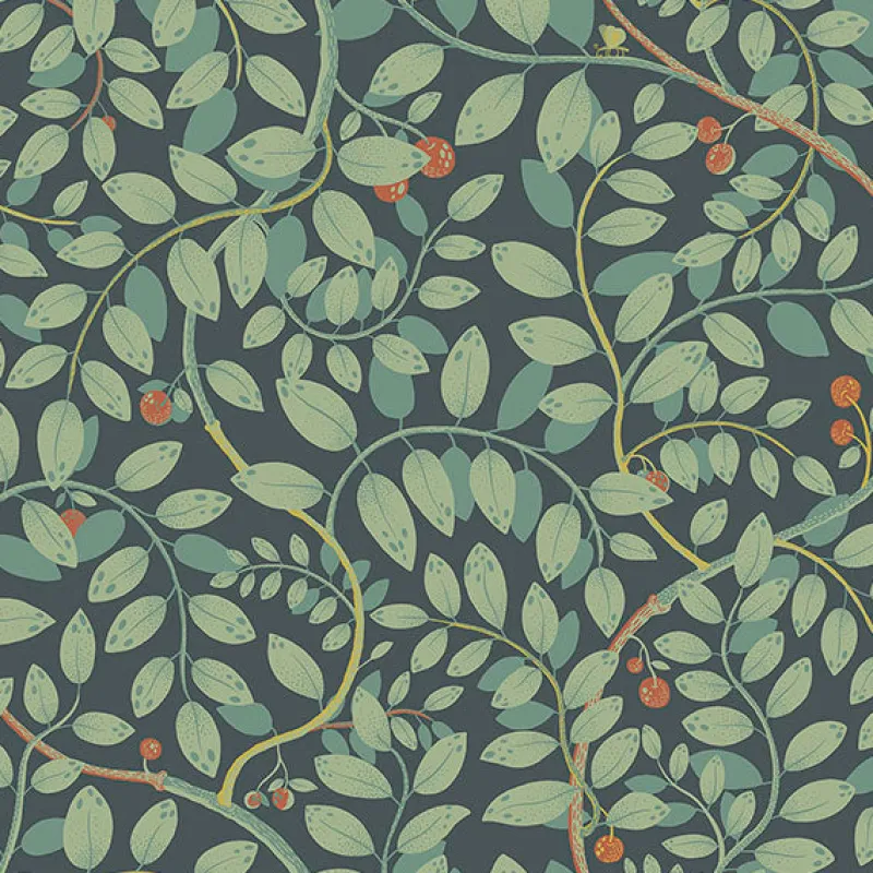 Bring the spirit of summertime to your interiors with this moody botanical wallpaper. The deep blue backdrop is decorated with winding, leafy vines that sport camouflaged moths and the occasional red, ripening cherry. Kirke is an unpasted, non woven wallpaper.