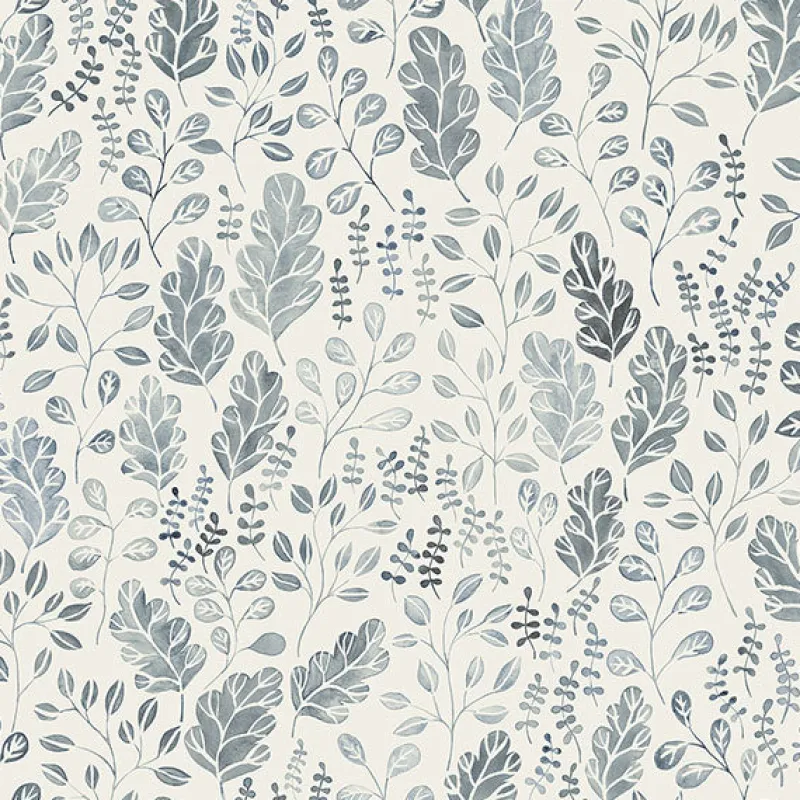 A classic palette of blue and white, this nature inspired design has an eclectic charm. The leaves’ faded colors create a block print effect. Isha is an unpasted, non woven wallpaper.