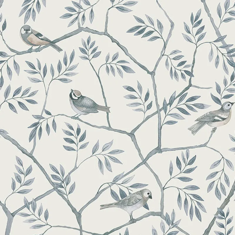 Light blue leaves sprout from slender branches in this dreamy wallpaper. Slate and beige birds complete its nature inspired design. Crossbill is an unpasted, non woven wallpaper.