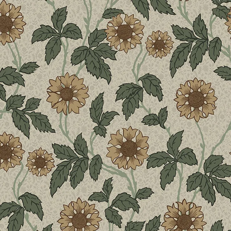 Transform walls into a blooming garden with this beige and green floral wallpaper. Hundreds of miniature grey flowers make up the off-white background, creating a dimensional and layered effect. Leilani is an unpasted, non woven wallpaper.