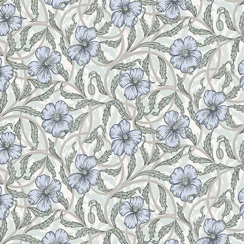 Fluffy light blue flowers flutter about grey geometrics and sage leaves in this romantic wallpaper. Its breezy energy will transform rooms into a serene escape. Imogen is an unpasted, non woven wallpaper.