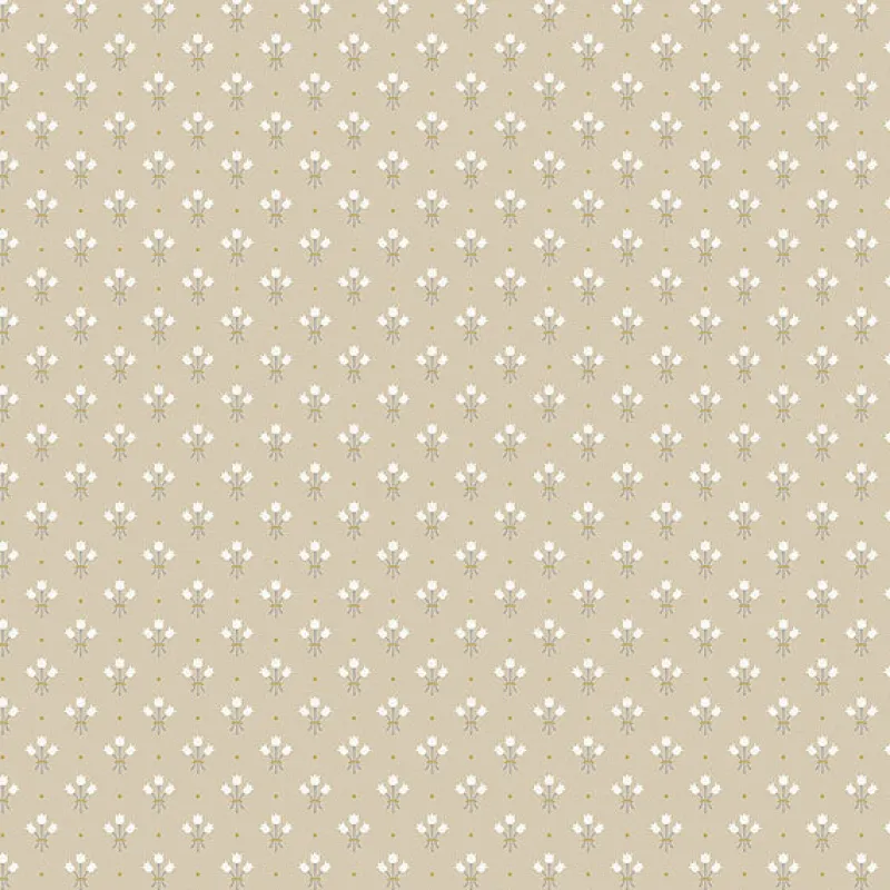 Bouquets of darling tulips make up this miniature floral wallpaper. Their white blossoms effortlessly complement the beige backdrop, while gold accents add a glamorous touch to its Scandinavian style. Lili is an unpasted, non woven wallpaper.