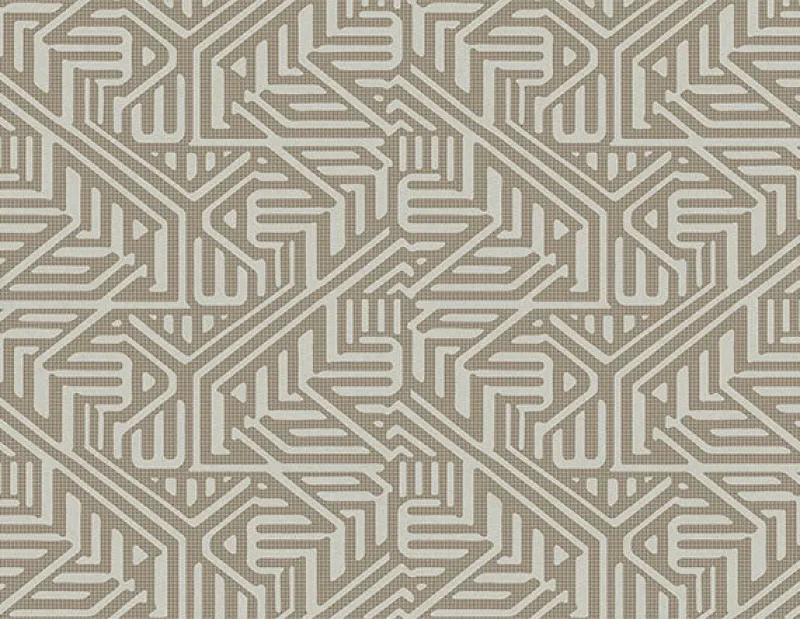 Add a global flair to rooms with this tribal inspired geometric. Grey and brown hues create a versatile palette, while heavily textured accents lend to its dimensional effect. Nambiti is an unpasted, fabric backed vinyl wallpaper.