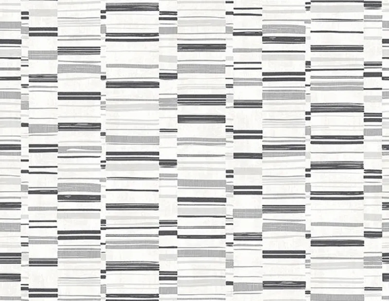 A linen inspired wallpaper with an abstract edge. Black and grey stripes effortlessly complement a heavily textured, white background. Fresnaye is an unpasted, fabric backed vinyl wallpaper.