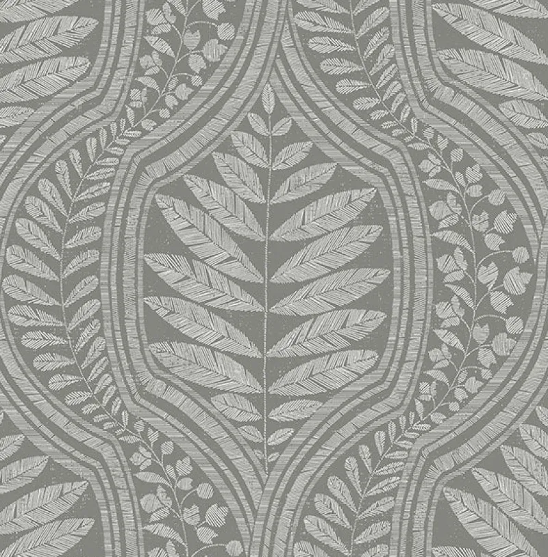 Bohemian mixed with Scandinavian flair, this floral wallpaper features a charming ogee print amidst its leaf design. The grey and white color palette lends a calming ambiance. Juno is an unpasted, non-woven wallpaper.
