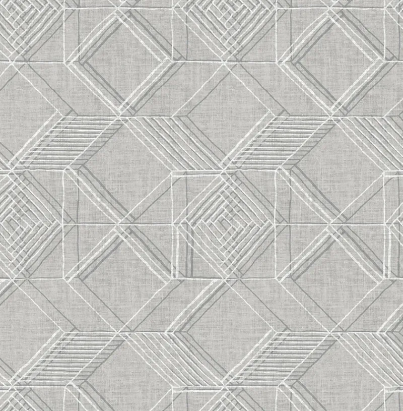 Cool and sophisticated, this modern geometric has a 3D effect. Set against a grey faux linen backdrop, the intricate lattice is duplicated, once in white and then shadowed in grey, both using raised inks. Moki is an unpasted, non woven wallpaper.