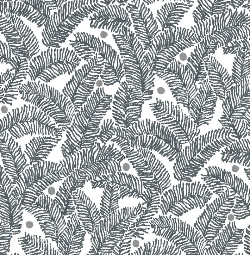 This Scandinavian-inspired botanical has a mystical feel. Groups of dark grey ferns arch across a white backdrop, accented by sporadic light grey dots. Athina is an unpasted, non woven wallpaper.