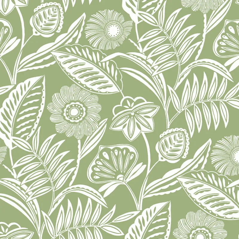 Instantly transport yourself on vacation with this two-tone tropical print. Flowering plants inked in white are designed to utilize the negative space of the moss green background. Alma is an unpasted, non woven blend wallpaper.