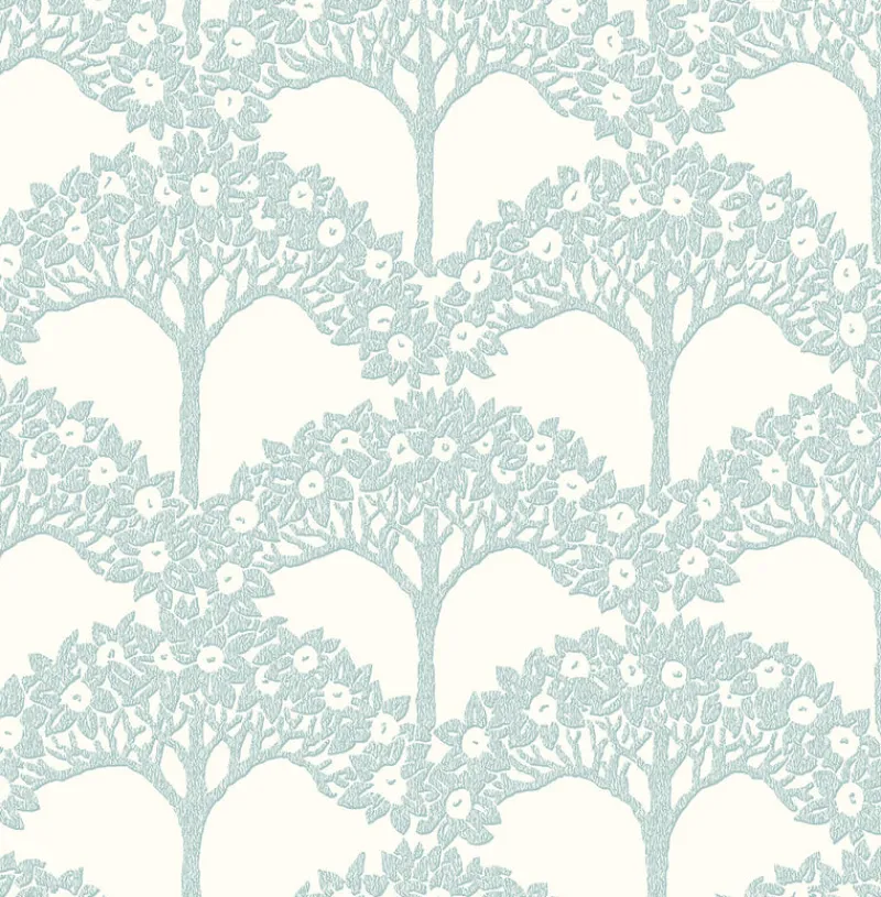 This elegant tree wallpaper adds hand-crafted ambiance to your home. The crackled, light blue of the trees brings an airy feel to this architectural design. Dawson is an unpasted, non woven wallpaper.