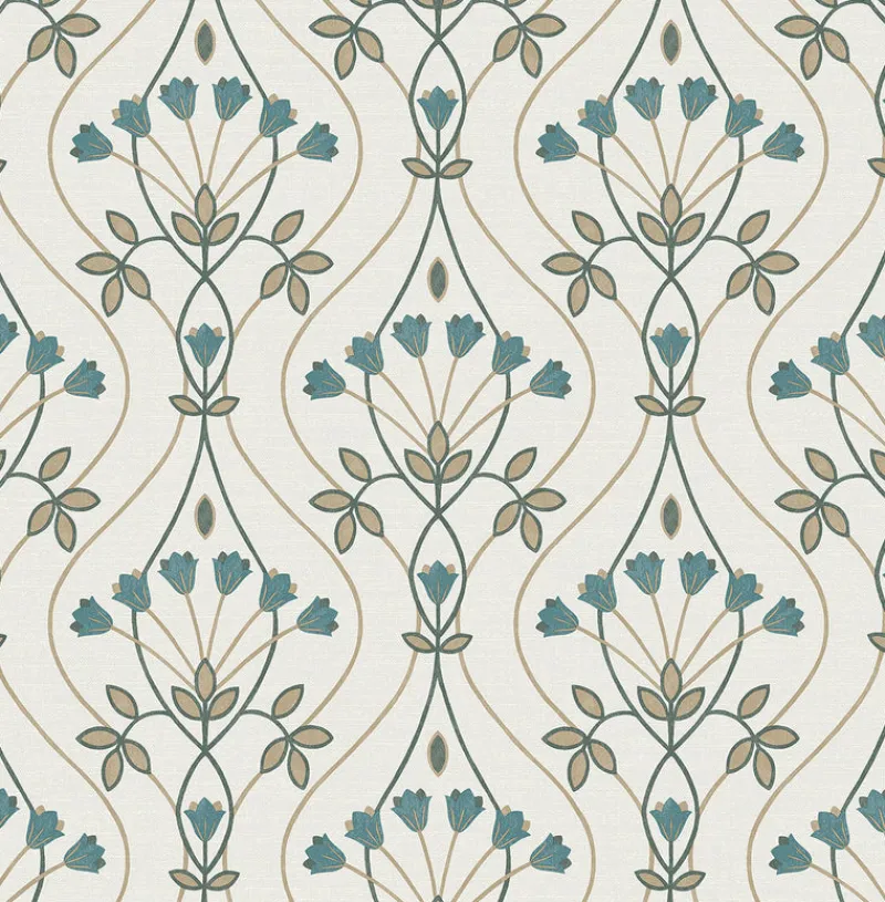 Add a touch of charm to your walls with this floral ogee wallpaper! The simple, curving lines of the ogee pattern are embellished with stylized tulips, the teal, dark green and gold hues jewel-like against an off-white backdrop. Dard is an unpasted, non woven wallpaper.