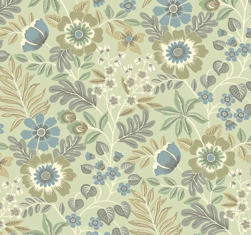 Charming with a slightly retro appeal, this floral wallpaper will breathe new life into your home. The soft color palette of light greens, greys, blues and taupe adds to the appeal of this illustrated design. Voysey is an unpasted, non woven wallpaper.