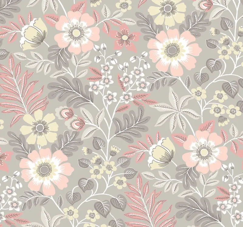 This sweet and slightly retro floral design will add considerable character to your home. The simple and charming illustrative design of the flowers and leaves is amplified by its pink, taupe and grey color palette. Voysey is an unpasted, non woven wallpaper.