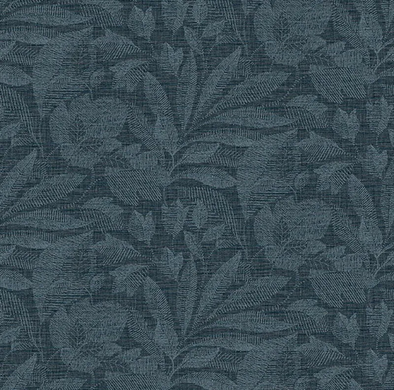 This modern botanical wallpaper is bursting with detail. Leaf imprints, composed of dozens of delicate light blue lines, overlay a rich navy backdrop that mimics the look of linen. Lei is an unpasted, non woven fabric backed vinyl wallpaper.