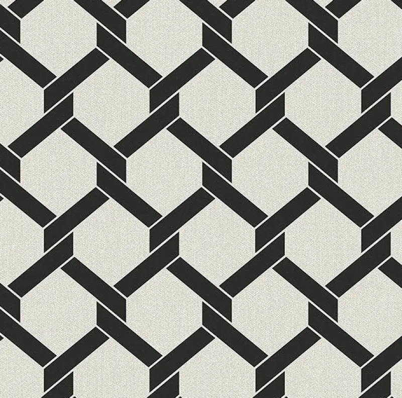 Trellis design is given a modern makeover in this geometric design! The black hexagons are linked together with a sharp twist, the entire design covered with raised inks that add subtle texture and depth. Payton is an unpasted, non woven fabric backed vinyl wallpaper.