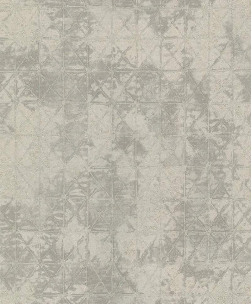 This wallpaper effortlessly combines Old World charm with modern convenience. The triangular tiles sport a mottled blend of grey accented with raised ink detailing lightly dusted in silver. Odell is an unpasted, non woven fabric backed vinyl wallpaper.