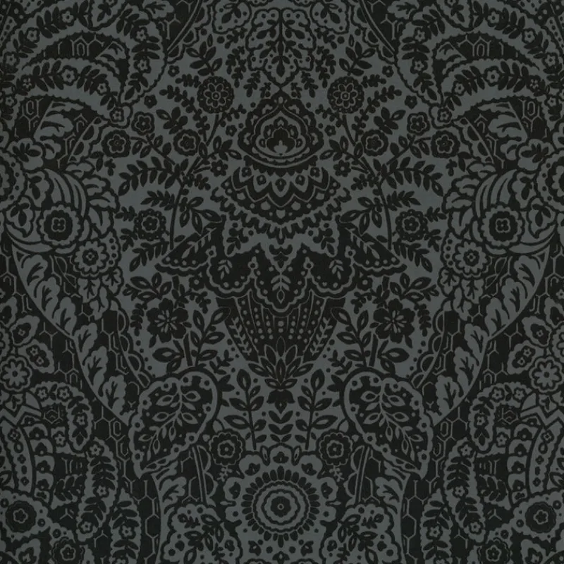 Dark coloring and luxurious finishes add a touch of drama to this charming floral damask. The illustrative botanicals are detailed in lush black flock against a charcoal grey backdrop. Maris is an unpasted, non woven wallpaper.