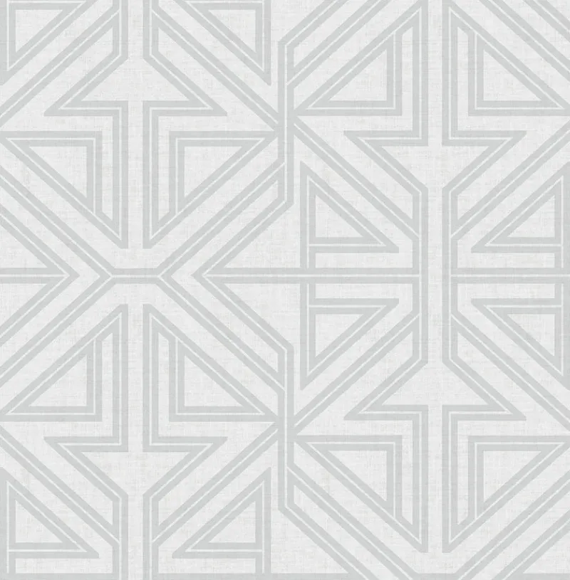 This bold geometric blends modern design with Old Hollywood aesthetics. Silver lines against light grey linen create a bright and luxe space. Kachel is an unpasted, non woven wallpaper.