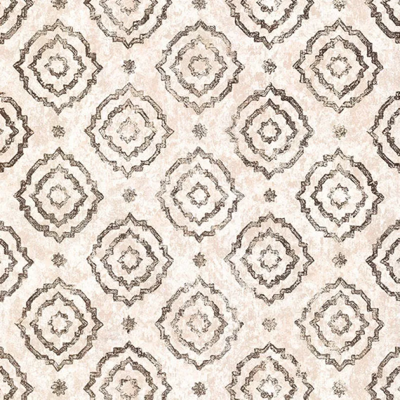 Add warmth and simple sophistication to your home with this geometric wallpaper. The mottled blush backdrop is covered with large and small star-like medallions finished in flashing rose gold. Uma is an unpasted, foil on non woven wallpaper.