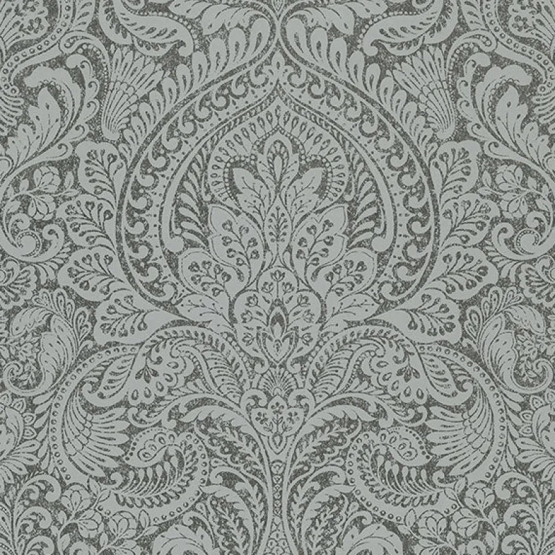 Imbue your interiors with regal opulence using this floral damask wallpaper. The large-scale design is richly embellished with botanical details and finished in a steely, metallic grey against a light grey backdrop. Artemis is an unpasted, foil on non woven wallpaper.