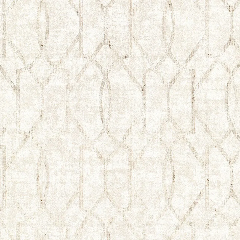 Enjoy a modern update to the classic elegance of trellis design. The variegated cream and taupe backdrop is overlaid with a curved and angular lattice composed of raised inks with a muted golden glow. Ziva is an unpasted, foil on non woven wallpaper.