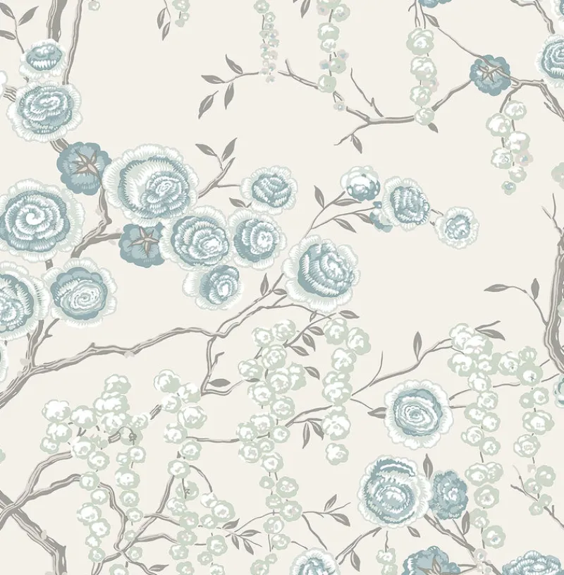 Dreamy and elegant, this chinoiserie-inspired floral straddles the line of modern and traditional for a truly transitional and versatile pattern. Metallic silver accents the dark aqua and seafoam blooms over a pale grey-tinted backdrop. Peony Tree is an unpasted, nonwoven wallpaper.