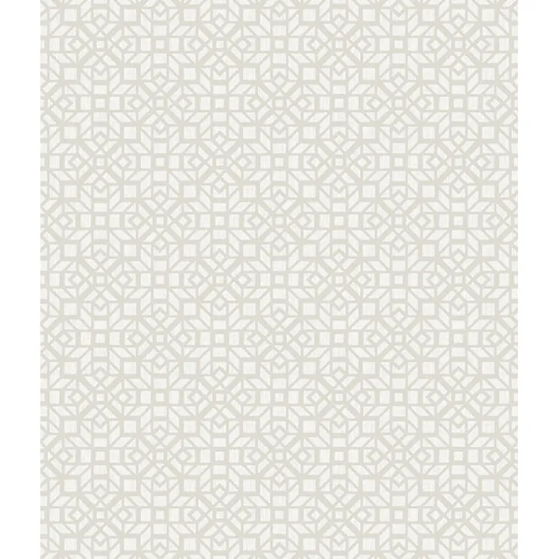 Light grey geometric quatrefoils create an intricate kaleidescope pattern in this light grey and white wallpaper.