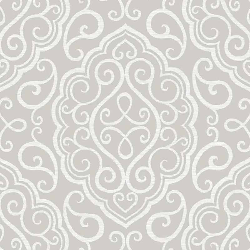 White scrolls create a pretty tile pattern in this simply intricate neutral grey wallpaper.