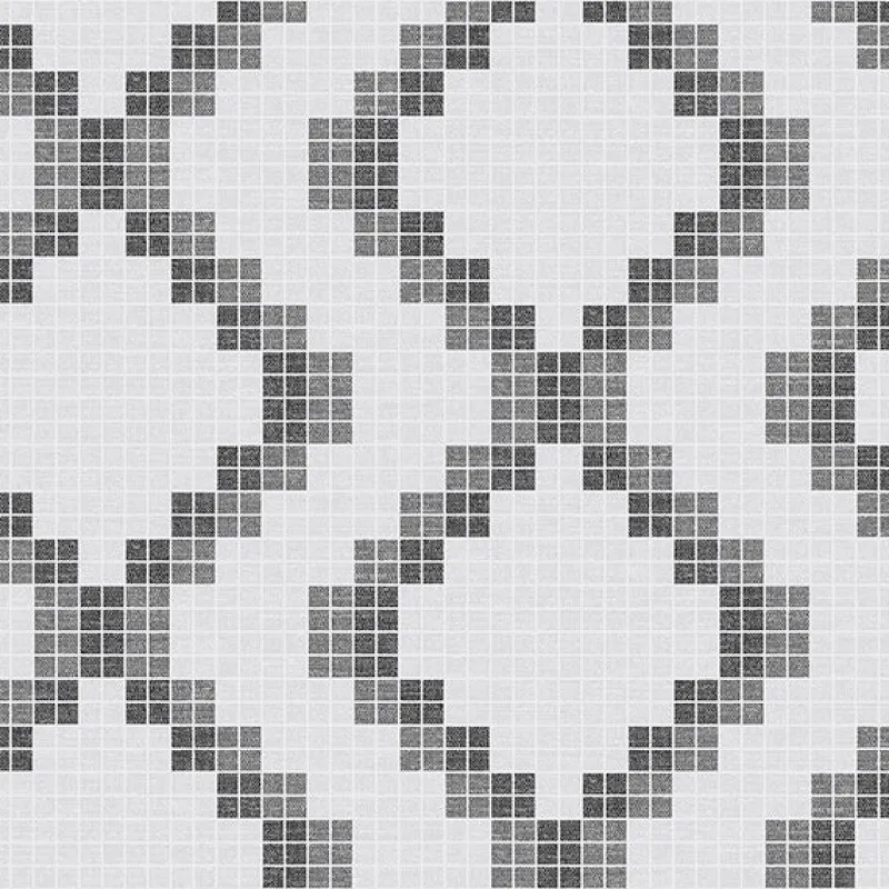 Pixelated squares create a larger contemporary and modern geometric Aztec pattern in this neutral black and white wallpaper.