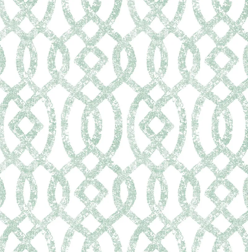 A light distressing and raised ink lend texture to this sea green color trellis pattern wallpaper. The contemporary pattern exudes style in a soothing shade of sea green over crisp white. Ethereal is an unpasted, non woven wallpaper.