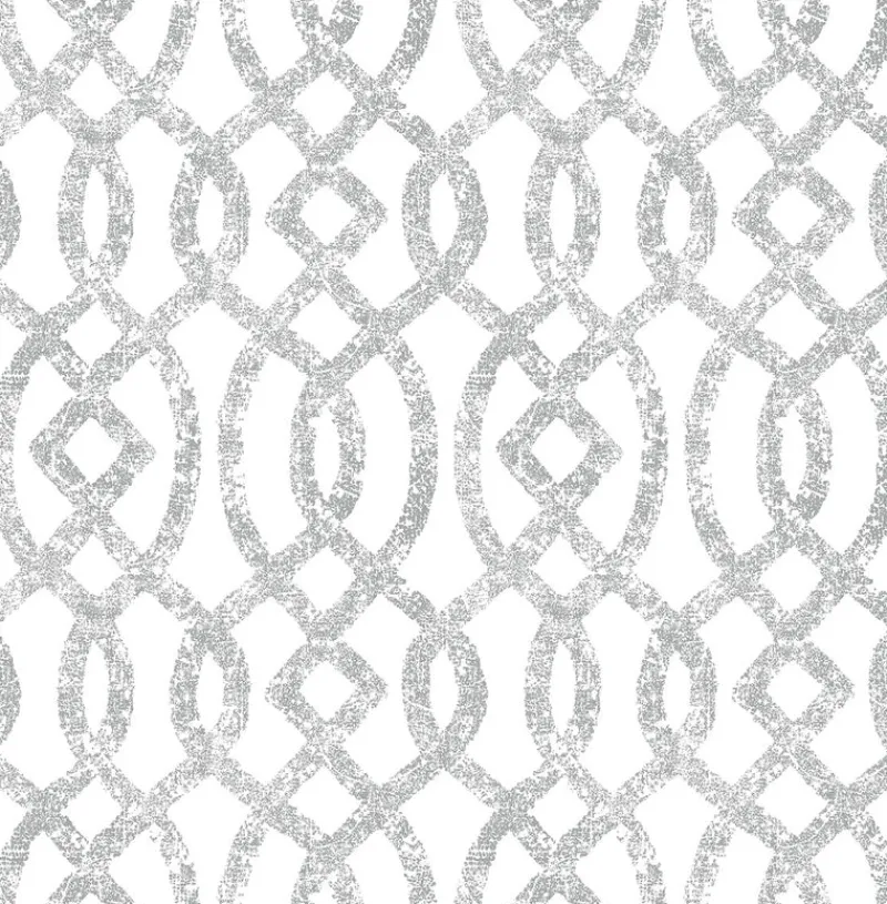In silver and white, this trellis wallpaper is perfect for the contemporary home. The metallic ink glimmers when struck with light for an enchanting visual effect. Ethereal is an unpasted, non woven wallpaper.