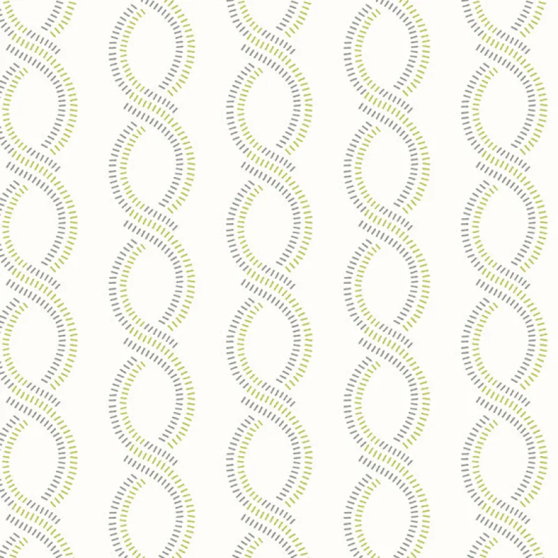 Little green and grey strie make up larger weaving stripes that look like figure eights for this simple ornamental stripe print to create a fun contemporary wallpaper.