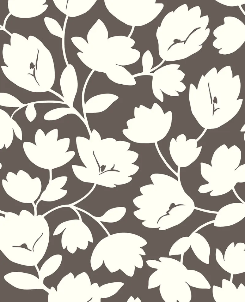 Flower silhouettes dance over a rich and welcoming shade of brown. The large-scale floral print is a warm white to complement the chocolate background. Matilda is an unpasted, non woven wallpaper.
