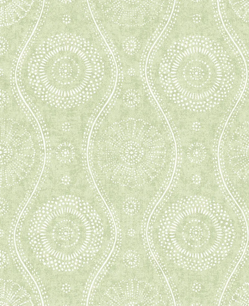 This playful medallion ogee is balanced by a vintage linen print background. The light green and white pattern feels fresh and invigorating. Painterly is an unpasted, nonwoven wallpaper.