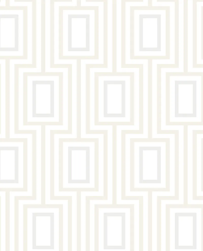 This retro-inspired, boxy geometric instantly draws the eye and visually heightens a space. Blueish grey boxes pop within the maze-like lines in bone. Metro Mod is an unpasted, nonwoven wallpaper.