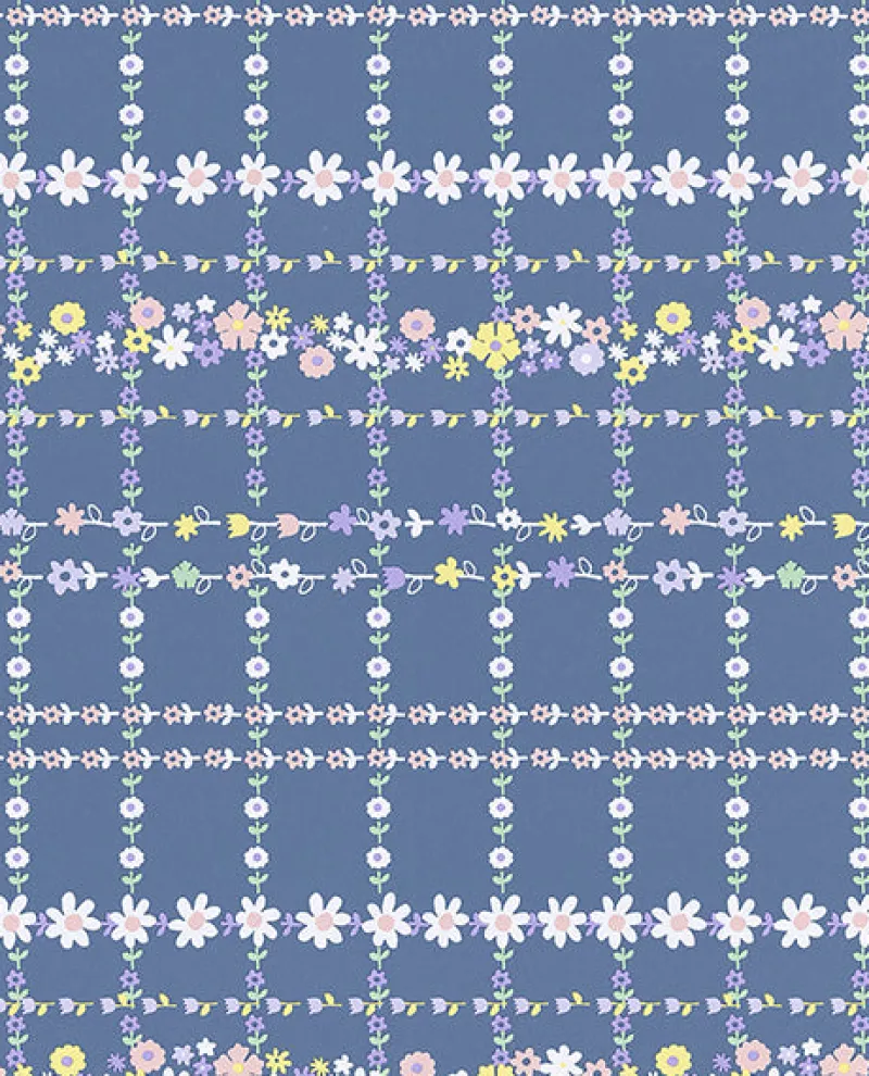 Yellow, white, peach, and purple flowers pop against a denim blue background. This folksy check wallpaper will make a room feel cozy.