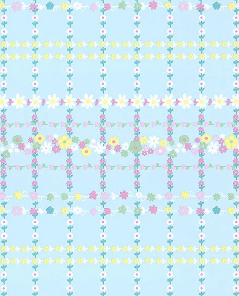 This light blue wallpaper is an adorable twist on plaid. Flower graphics in yellow, pinks, green and teal form a cheerful check pattern.