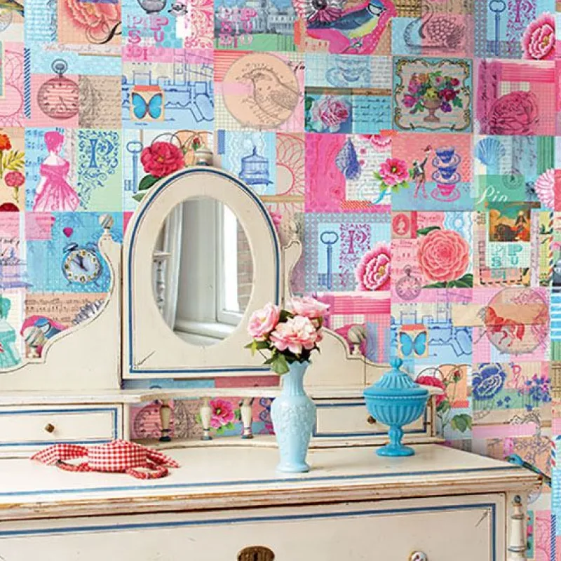 This vintage medley of old postcards and notes has been beautifully erected into an enchanted collage filled with flowers and birds, antique keys and pocket watches. Bring a delightful look to walls with this stylish and whimsical mural design. Comes in four panels that assemble into a 6′ 1″ x 9′ 2″ mural.