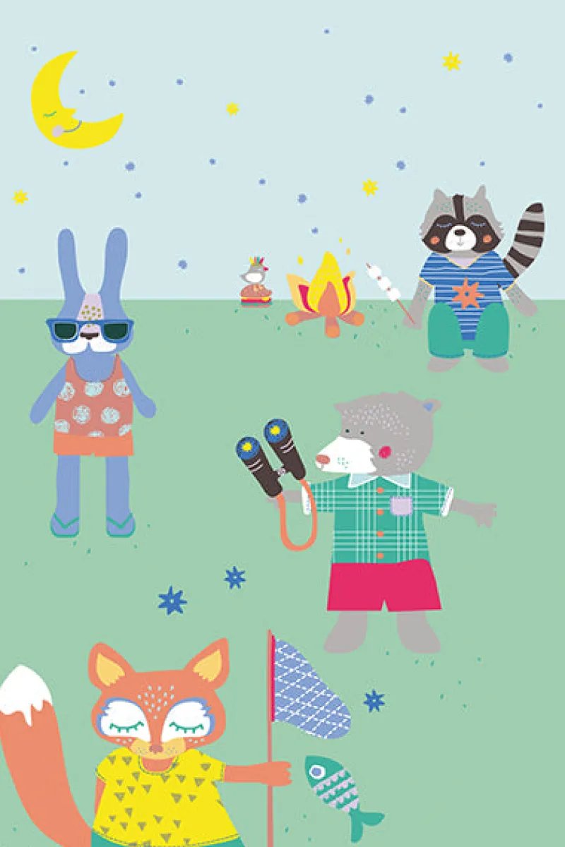 Nothing like exploring on holiday! Charming cartoon creatures adventure around a campsite under a starry sky in this mural. Comes in 4 panels that measure 9 feet 2 inches tall x 6 feet 1 inch wide when assembled.