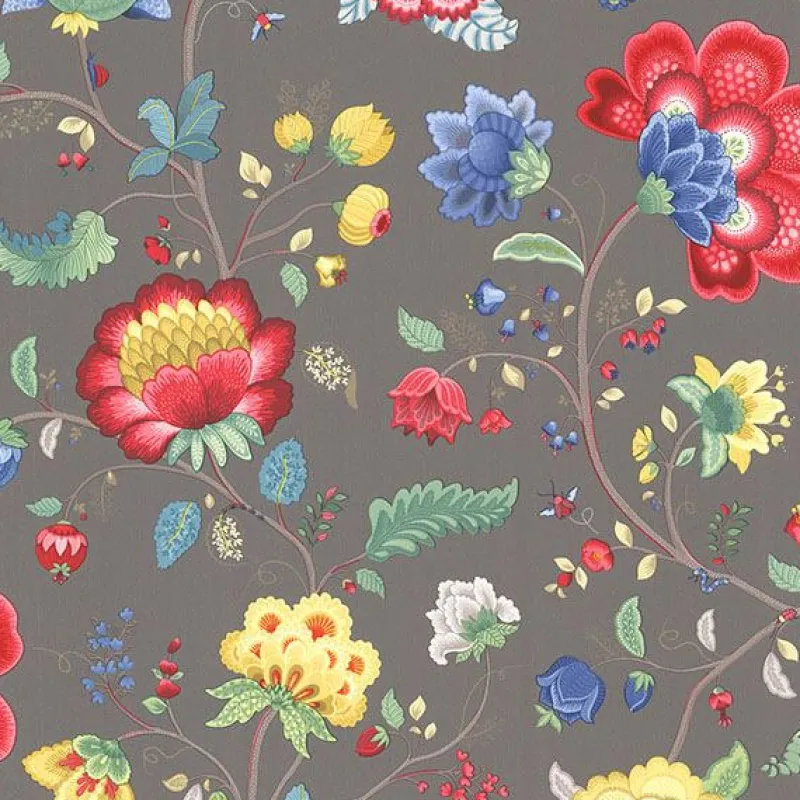 With a gorgeous charcoal base, this colorful floral trail is an inspiring vision. Seeming to bloom from all parts of your room, this Jacobean style wallpaper is treated to a dazzling array of luxe metallic accents.