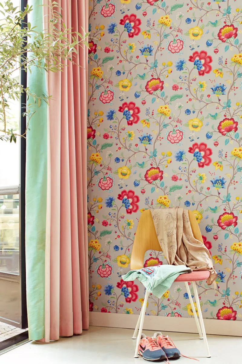 A beautiful fog base comes alive in all colors of the rainbow on this fanciful wallpaper that makes a happy chic decor statement.