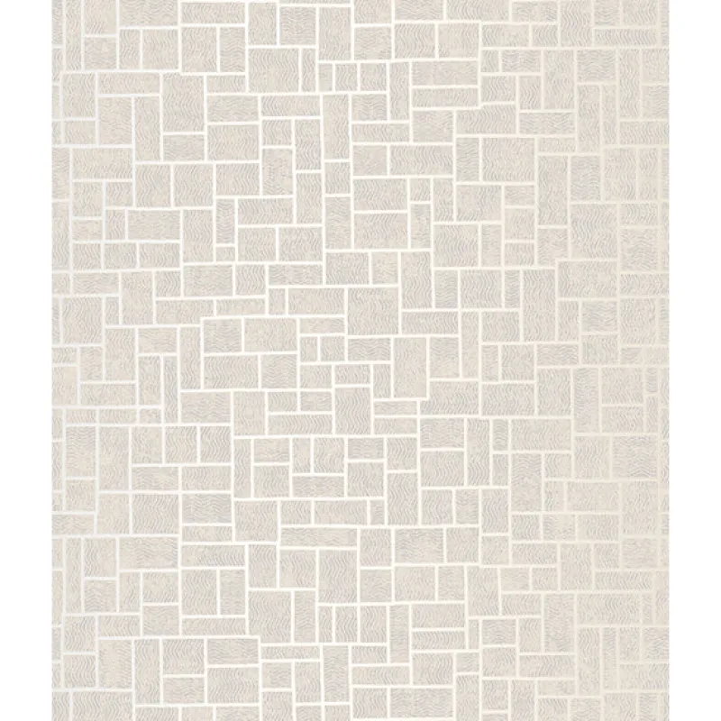 This geometric wallpaper is a lesson in mixing metallics. A sleek cool gold background peeks behind the rectangles. Tactile silver waves create further pattern on top of the design.