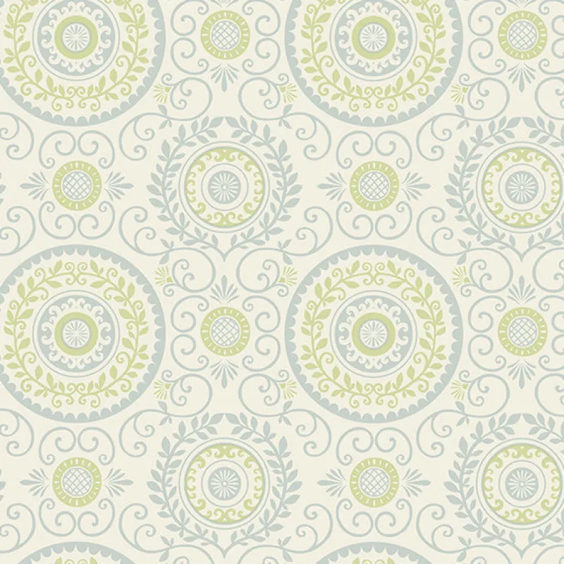 A vintage medallion print wallpaper is perfect for adding a whimsical flair to your home décor. This light blue and fern green design is a beautiful botique style wallpaper.