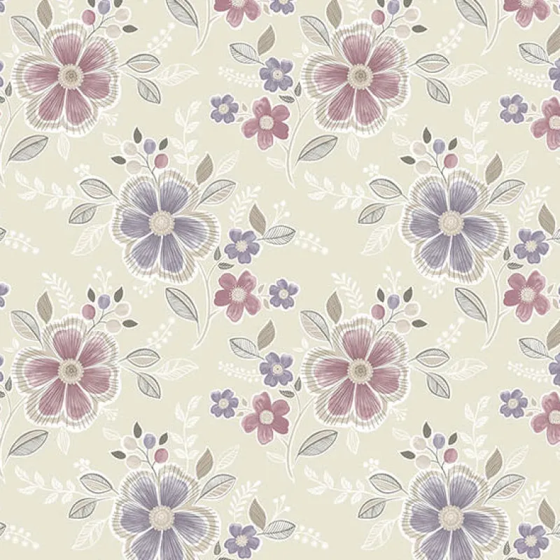Soft jewel tones blend harmoniously with a neutral taupe background in this floral wallpaper. Muted magenta and midnight purple blooms combine beautifully with white leaf silhouettes. Modern and whimsical, this wallpaper will look lovely in your home.