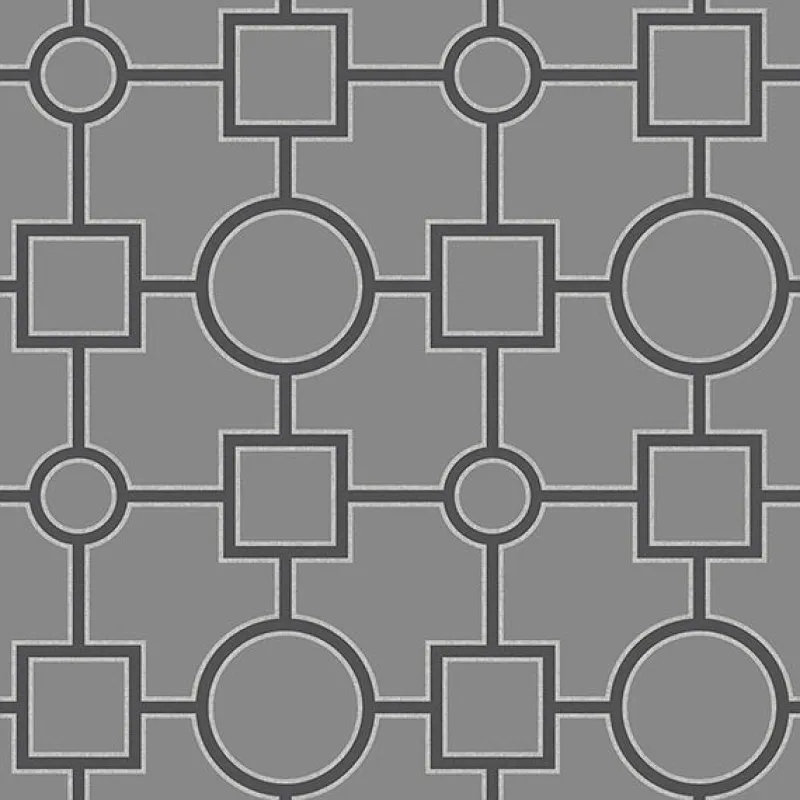 A striking geometric with mod influence. This wallpaper’s reserved color palette of charcoal and black makes it a versatile addition to your home. The finishing touch to this pattern is a metallic silver border around the design.