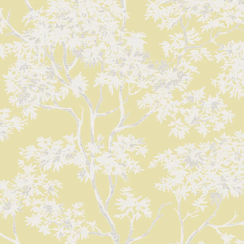 Yellow and grey are an unexpectedly elegant combination. A stately tree print has branches sprinkled in pearlescent silver. This wallpaper is finished with a subtle printed texture as another layer of dimension.