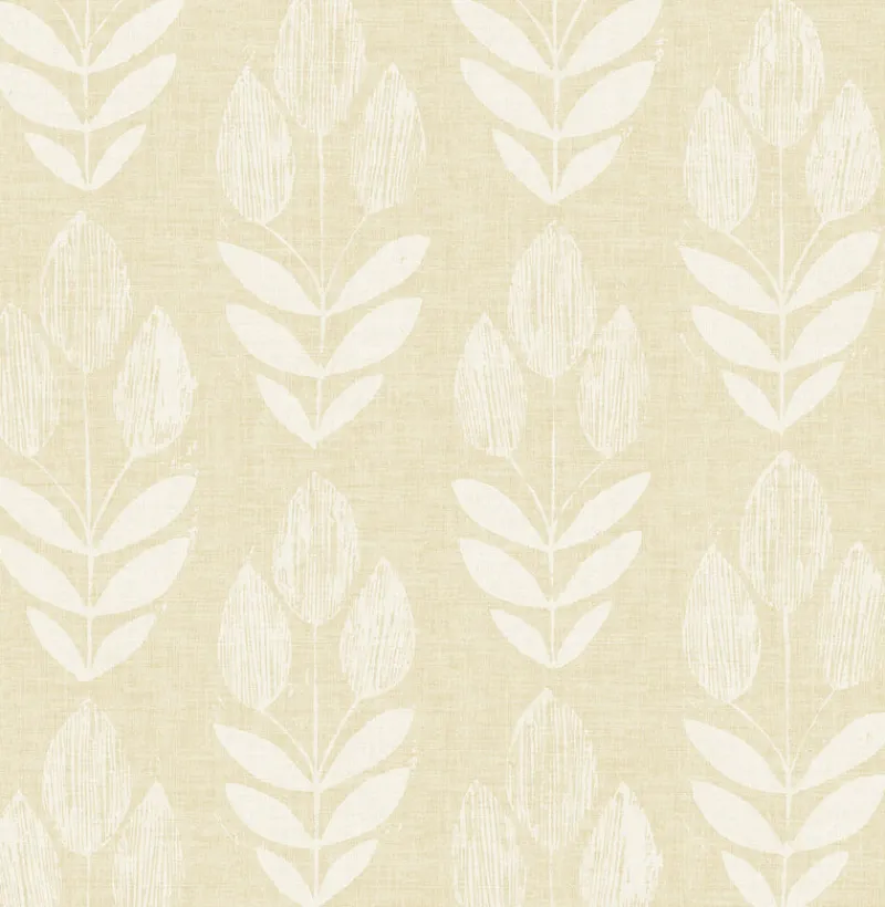 Resembling linen, this cheerful wallpaper has a lovely wheat hue. Its white folk tulip design gives it a Scandinavian feel. Garland is a prepasted, non woven wallpaper.
