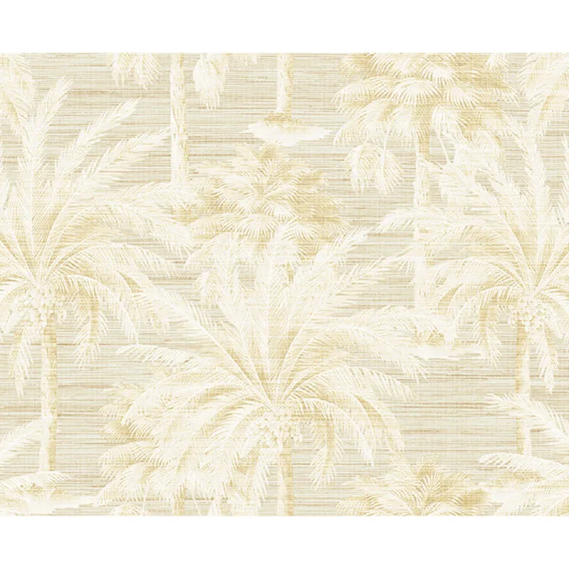 Light tan palm trees scale this neutral grey grasscloth for a pretty monochromatic wallpaper.