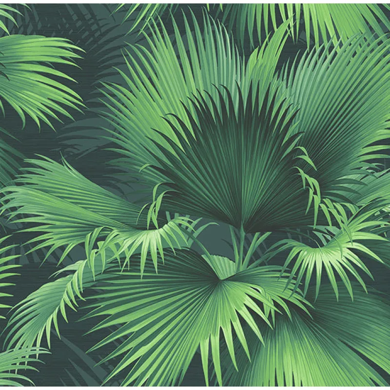 Forest green and bright green palm leaves fan out in natural half circles all over this fun wallpaper.
